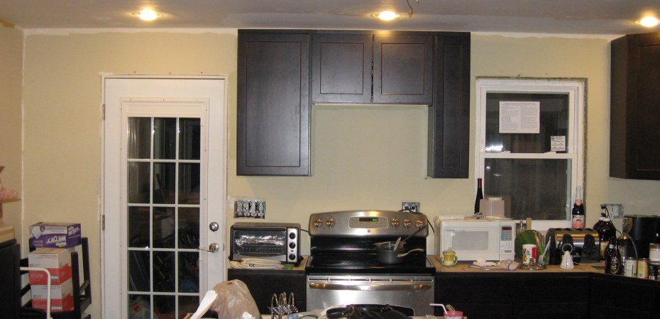While our tenants were moving into our previous home, a 4 year old, 2100 square foot, beautiful new-ish colonial, we were moving into our new house, a complete cluster of a renovation project, and not lying; I sort of wanted to vomit. Walking in the front door wasn’t too terrible at first glance. A newly opened floor plan revealed the fresh hardwood floor sprawling from the living room space into the kitchen, and about three-quarters of the kitchen cabinets were installed. Only the office workspace cabinets still needed to be installed, mainly because we found the pantry cabinet came in damaged and it’s location in the kitchen meant that the adjoining workspace had to wait. So the workspace cabinets were just set in place where they should be installed, next to the broken pantry… and there were no countertops… or stove… or dishwasher… or kitchen sink… or closet doors… or trim on most of the interior doors… and massive ceiling patches and drywall seams on the walls hadn’t been finished or painted. But, we had a new floor and most of our new cabinets!